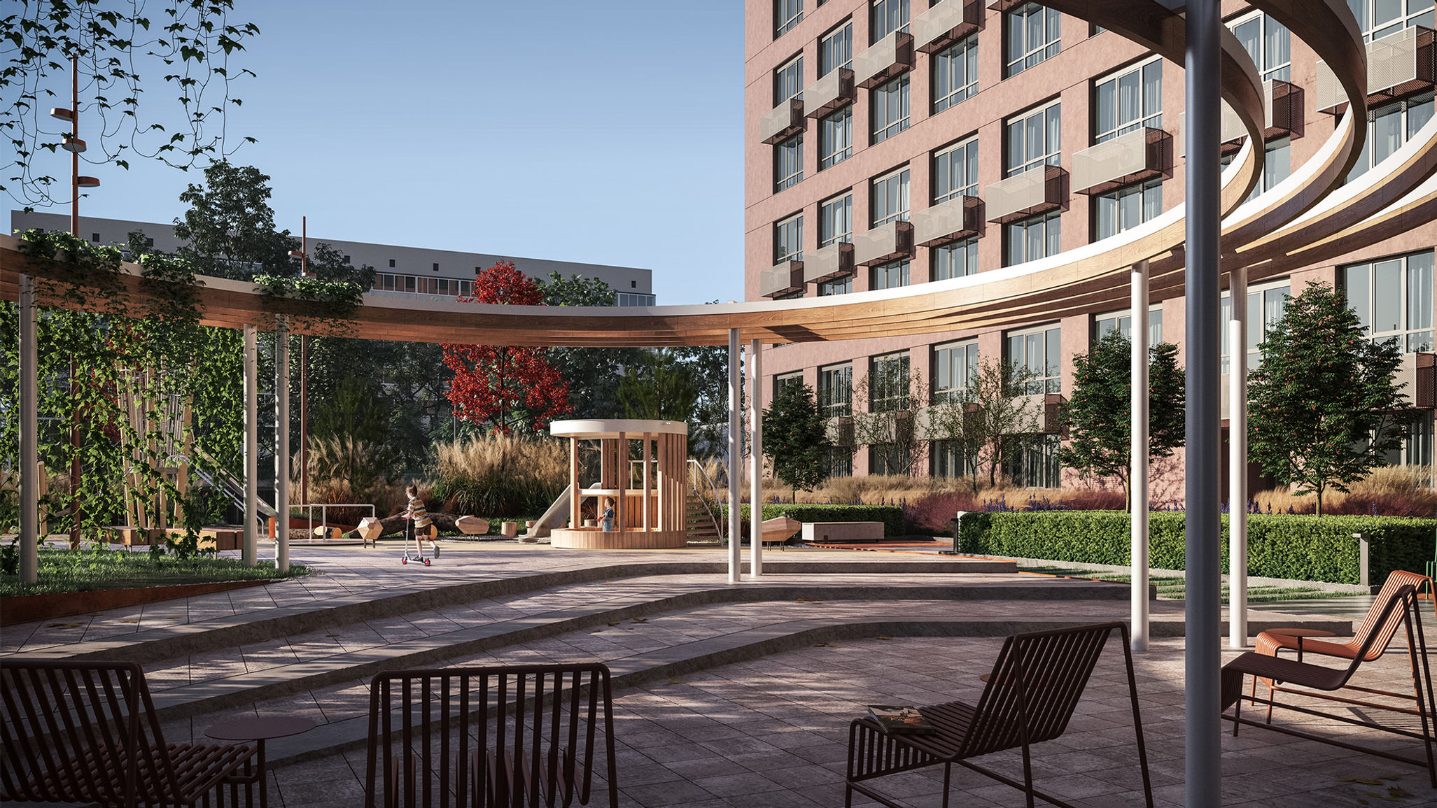Головна ідея ландшафтного дизайну стилобатної частини - підкреслити архітектурні рішення будинків. Саме тому обрано естетику криволінійних форм, які переплітаються із ортогональними векторами доріжок і периметром стилобату. Художність цього симбіозу підкреслює виразну архітектурну концепцію.
